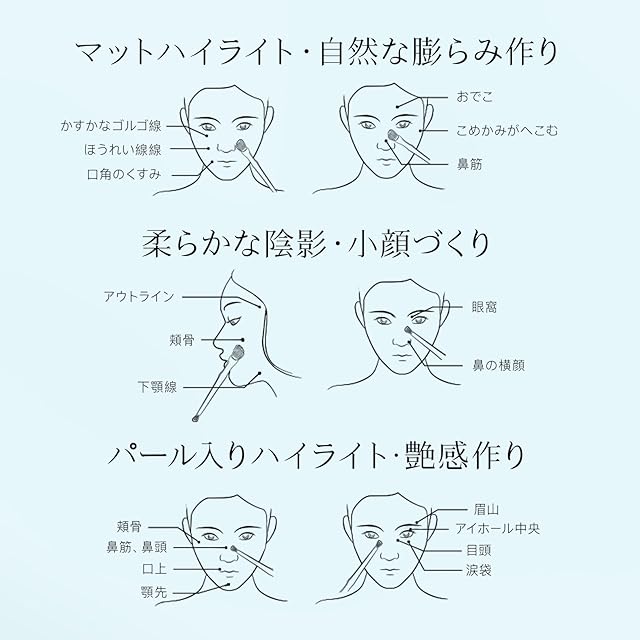 【多彩な使い方】頬骨、下顎線、アウトライン、鼻の横顔、眼窩のところにシャドウを軽くのせると、輪郭が収縮できます。微かなゴルゴ、ほうれい線、口角のくすみ、額、こめかみなどにマットハイライトを入れると、くぼみが改善されます。パールハイライトでチーク、鼻筋、口上、顎先などの部分を明るくすることができて、肌に艶感を与えます。