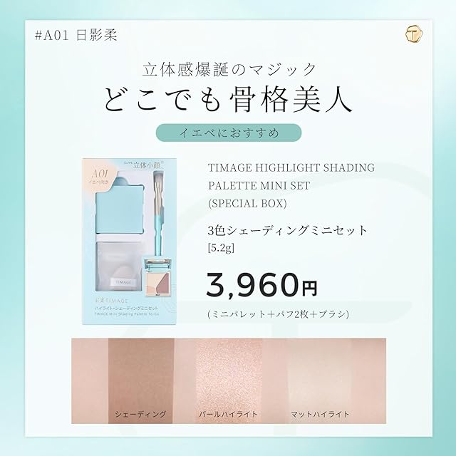 日本市場向け最適化された3in1コンパクトパレット TIMAGEの限定デザインとなる3色ミニパレットは、マットハイライト・ツヤハイライト・シャドウの多機能をミニサイズに凝縮。微細パウダーがアジア人の肌質に自然に密着し、頬骨の立体感強調から鼻筋のシャドウ加工まで、プロ仕様の仕上がりを実現。初心者でもムラなく重ね塗りできる特殊配合技術を採用し、付属のアングルブラシとダブルサイドパフで化粧直しも容易。肌トーンに合わせた3色展開で、外出先でも本格的な立体メイクを手軽に完成させる携帯性の高さが特徴。