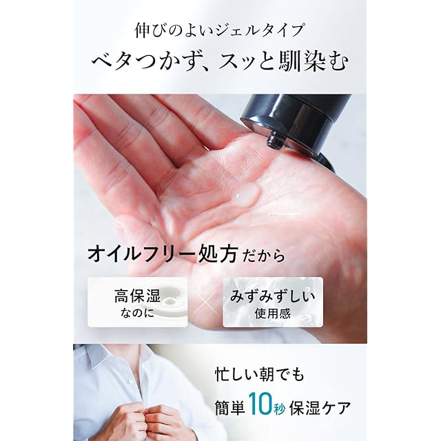 【ノーストレスな使用感】オイルフリー設計でみずみずしくサラっとした使い心地。ジェルがしっかり浸透するので、肌表面にベタつきを残しません。化粧水では物足りない、クリームのベタつきが苦手な男性の為にオイルフリー、粘度調整剤不使用のジェルタイプ。徹底した7つの無添加処方で敏感肌でも◎信頼の日本製。