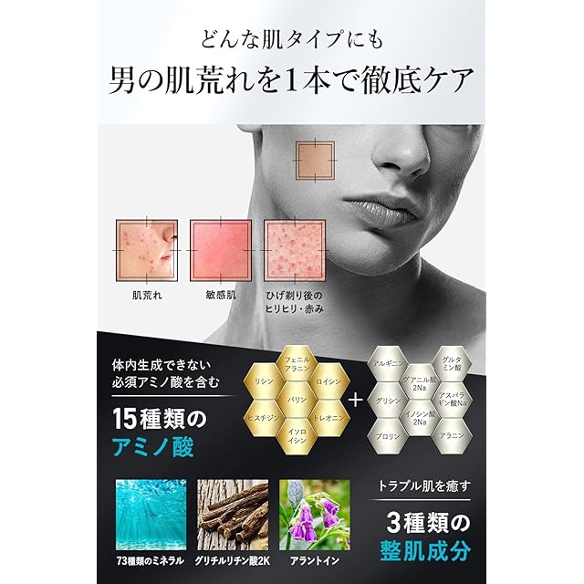 【見た目年齢が変わる】金・銀・白金やビタミンA、ビタミンC、ビタミンB6など美容効果の高い製成分を配合。紫外線や年齢からくる肌悩みをサポートします。さらに、ハマメリス水がアプローチし男肌の毛穴悩みもキュッ!若々しい印象に。30代、40代、50代の多くの男性に選ばれています。