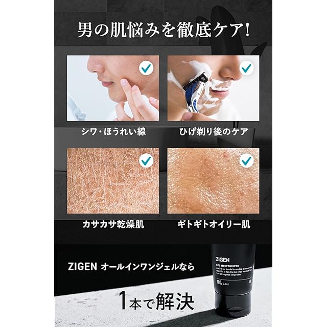 【一番お得な2本セット】 化粧水・乳液・クリーム・美容液を1本に凝縮。カサつき・テカリ・べたつき・ひげ剃り後のヒリヒリ・疲れた肌印象・毛穴が目立つ。そんな大人の男性の肌悩みケアする注目成分を配合しました。オールインワンジェルだからひと塗りでお手入れ完了。朝晩2回使用でたっぷり約8ヵ月分。内容量:200g×2本 【高保湿でハリ肌】保湿の王様と呼ばれる「ヒト型セラミド」をはじめ「コラーゲン」「ヒアルロン酸」「プラセンタ」など35種類の保湿成分を贅沢に配合。スポンジのように水分を抱え込み、隙間なくヒタヒタに潤します。肌の乾燥を防ぎ、潤いのあるみずみずしいハリ肌に。 【長時間保湿でテカらない】保湿力の高さだけではなく、潤いの持続力が長時間続くのもZIGEN オールインワンジェルの大きな魅力。潤いをキープすることで過剰な皮脂分泌を抑え、テカりやベタつきを抑えま。乾燥肌だけでなく、オイリー肌にお悩みの方にもおすすめ。 【見た目年齢が変わる】金・銀・白金やビタミンA、ビタミンC、ビタミンB6など美容効果の高い製成分を配合。紫外線や年齢からくる肌悩みをサポートします。さらに、ハマメリス水がアプローチし男肌の毛穴悩みもキュッ!若々しい印象に。30代、40代、50代の多くの男性に選ばれています。 【ノーストレスな使用感】オイルフリー設計でみずみずしくサラっとした使い心地。ジェルがしっかり浸透するので、肌表面にベタつきを残しません。化粧水では物足りない、クリームのベタつきが苦手な男性の為にオイルフリー、粘度調整剤不使用のジェルタイプ。徹底した7つの無添加処方で敏感肌でも◎信頼の日本製。