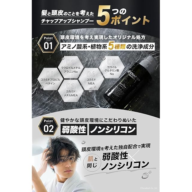 5種類の高級アミノ酸系・植物系洗浄成分使用。オーガニックエキス10種配合の弱酸性で頭皮の潤いそのままキープ。濃密で、心地よい洗い上がり。毛髪診断士による開発・監修。無添加・天然成分にこだわり、洗髪するたびに健康な頭皮環境を保ちます。 【使用方法】1プッシュ分のシャンプーを手のひら、もしくは後頭部から側部でよく泡立てます。泡が頭皮全体をしっかりと包み込むまで1プッシュずつ追加し、泡立てていきます(使用量は髪の毛の長さによって異なります)。 ※チャップアップシャンプーには髪の毛に良い成分がギュッと濃密に詰まっているため普通のシャンプーに比べ、粘度が高くなっています。このためポンプ部分が重く戻りづらいとお感じになる場合もございますが不良品ではございませんのでご了承くださいません。