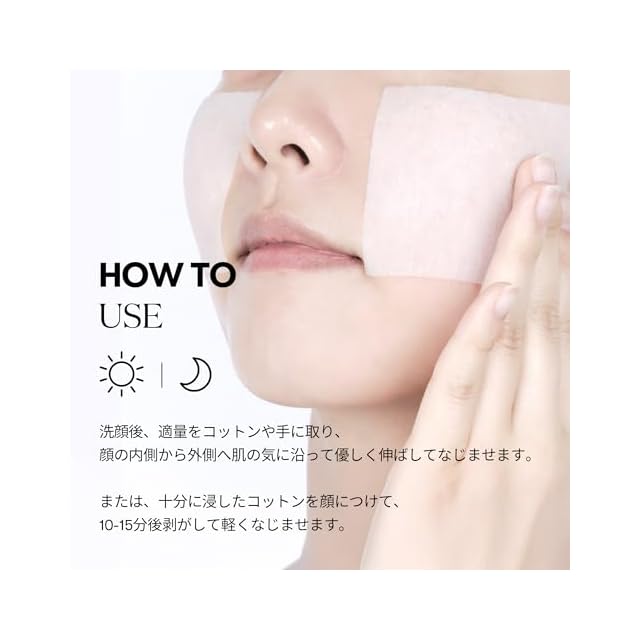 ☘【使用方法②】1.十分に浸したコットンを顔につける。2.10~15分後、コットンを剥がして軽くなじませる。