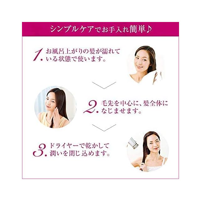 【使用方法】Step1.洗髪後、タオルで軽くおさえるようにして、余分な水分を拭き取ります。Step2.手のひらにヘアエッセンスを適量取り、毛先を中心につけた後、髪全体になじませます。Step3.根元から毛先に向かってドライヤーで乾かします。最後に冷風で仕上げるとツヤ感がアップします。