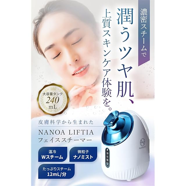 「潤うツヤ肌、上質スキンケア体験を。」NANOAリフティア フェイススチーマーは、乾燥肌、混合肌、ゆらぎ肌が気になる‥そんなあなたのために美容皮膚科医と共同開発したプレミアムフェイススチーマーです。