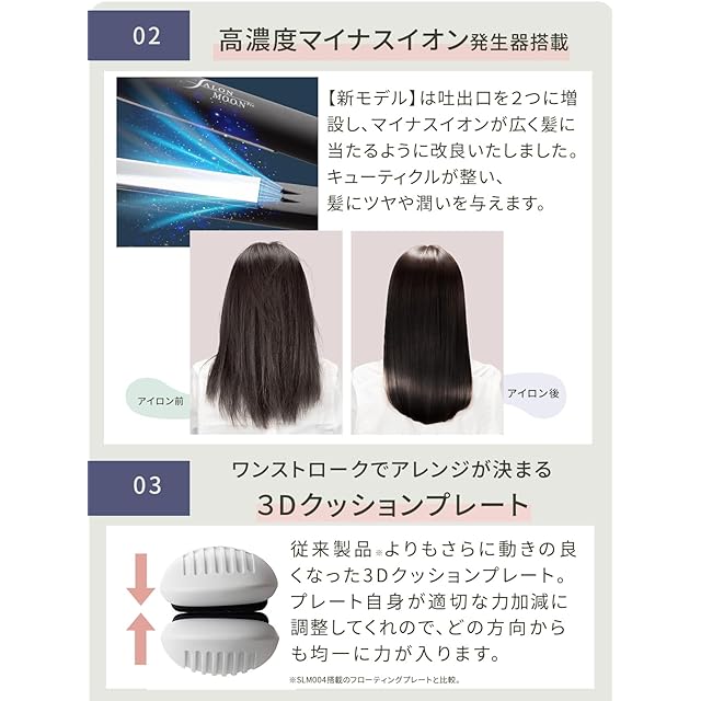 リーズナブルなのに高品質を実現した ストレート ヘアアイロン。ヘアアイロン “本体”に全精力を注ぎました プロ仕様 サロンクオリティを実現 。・従来製品*の約2倍の高濃度ダブルマイナスイオンで、うるツヤ スタイリング を実現。・従来製品の約2.14倍なめらかなミラー チタニウムプレート で面白いほど髪にツヤを与えます。 ・縮毛矯正でも使われるMAX230℃のパワフルなヒーターを搭載。80℃~230℃まで5℃間隔31段階で温度設定ができるから髪質に合わせたスタイリングが可能になりました! ・なめらかなプレート はスタイリング時の髪へのダメージを抑えます。 ・ マイナスイオンを強力噴射する強化版 高濃度ダブルマイナスイオン発生装置を搭載。 キューティクルを保護し、さら艶ストレートを実現 。・3Dクッションプレート は 上下左右にクッション性のあるフローティングプレートを採用し、ストレートだけでなく、様々なアレンジにも対応ができるようになりました。 ストレートにも沈み込むクッションプレートでむらなく圧力をかける事ができるので摩擦を抑え、髪へのダメージを抑えることができ、綺麗なスタイルに仕上がります。また、髪を挟む力が強いので1回で簡単にストレートヘアが完成します。ロングヘア、ボブ、ショートカット、前髪用 どんなスタイルにも◎。カールもストレートもできる2WAYタイプです。弊社の委託工場はアメリカ、ヨーロッパ、日本国内の一流ブランドを製造する工場で製造しております。 SALONMOONは信頼できる品質の商品をできるだけリーズナブルに提供しております。