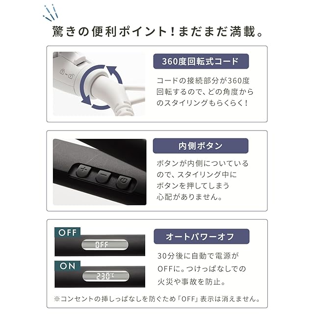 ✅【 31段階 温度設定 】80℃~230℃まで5℃間隔で31段階の設定が可能。スピードヒーター搭載で忙しい朝でもあっという間に使用可能温度に到達します。温度上昇確認モニターで1℃ずつ温度上昇を確認できて便利! サロン用 として プロ の 美容師 さんにも 人気 です。 ✅【 海外対応 】100V~240Vまで対応しているので、海外 でも使用できます。※変換プラグはご用意ください。✅【 持ち運び にも】ロック機能搭載で コンパクト に 収納 ができます。旅行 などの持ち運び にも便利です。