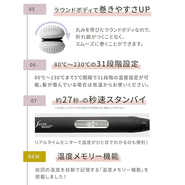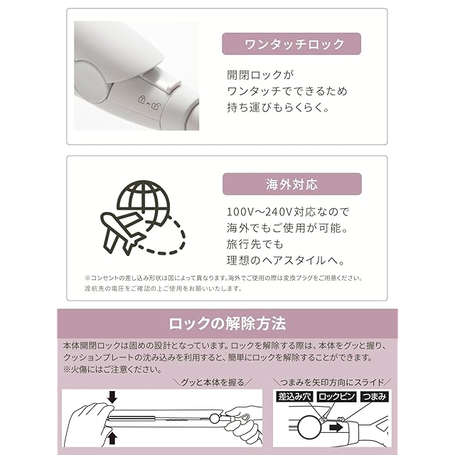 ✅【 31段階 温度設定 】80℃~230℃まで5℃間隔で31段階の設定が可能。スピードヒーター搭載で忙しい朝でもあっという間に使用可能温度に到達します。温度上昇確認モニターで1℃ずつ温度上昇を確認できて便利! サロン用 として プロ の 美容師 さんにも 人気 です。 ✅【 海外対応 】100V~240Vまで対応しているので、海外 でも使用できます。※変換プラグはご用意ください。✅【 持ち運び にも】ロック機能搭載で コンパクト に 収納 ができます。旅行 などの持ち運び にも便利です。