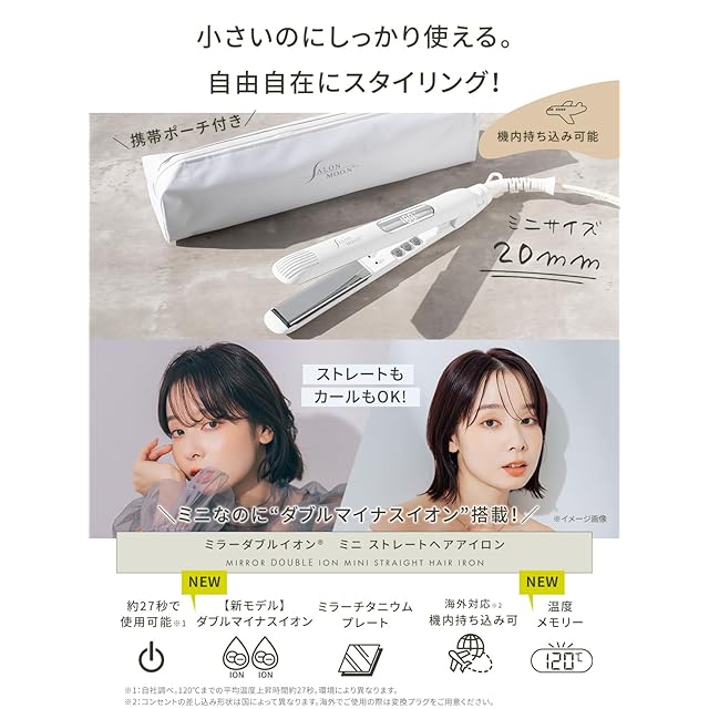 【 コンパクト 軽量 】 SALONMOON (サロンムーン) ミニ ストレート ヘアアイロン ミラーダブルイオン 20mm 持ち運び 旅行用 2way ホワイト ポーチ付き 海外対応 高濃度マイナスイオン ヘアアレンジ ショートヘア 前髪
