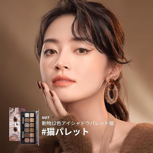 「ブラウンアイシャドウ」12色アイシャドウパレット 猫、王道のブラウン系で初心者でもらくらく!ブラウン・チョコレート系の12色の濃淡で、ナチュラルグラデアイがオススメ。自然に大きな目もとを叶える。