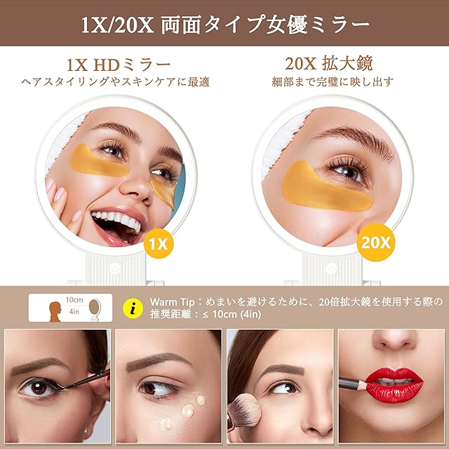 商品名:Auxmir 女優ミラー 鏡 卓上 拡大鏡 20倍と等倍両面鏡 72個LEDライト付き 3光色 折りたたみ式 手鏡 明るさ無段階調光 角度調整可能 USB充電式 2000mAh大容量バッテリー 化粧鏡 ハンド&スタンドミラー 卓上/吊り下げ/手持ち可能 ハンドル付き コンパクト 旅行用 持ち運び便利 円形 ホワイト