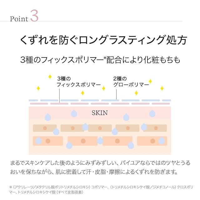 毛穴管理に着目した5 つのアプローチを行う成分を配合 バイユアのベースメイク・スキンケアに共通する「毛穴管理」のコンセプトに必要な、5つのアプローチを行う 成分を贅沢に配合しました。日中も肌・毛穴にうるおいを与え、なめらかに引き締めます。まとっている時間が長いベースメイクにこそスキンケア効果が必要だと考える、バイユアのこだわりです。 ※毛穴管理:乾燥した毛穴にうるおいを与えて毛穴の目立ちを気にならなくすること