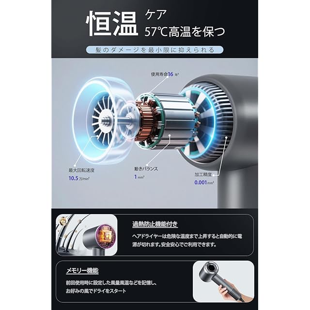 【安全機能充実・サロン級仕様】過熱防止機能や防塵フィルターを備え、安全性に優れた最新型 ヘアドライヤー。美容師監修のサロン級仕様で、家庭用でもプロ級の仕上がりを実現します。速乾性能を持つ ドライヤー 大風量 は、髪を守りながら素早く乾かす信頼の ドライヤー速乾。日常的に安心して使える高品質 ドライヤー です。