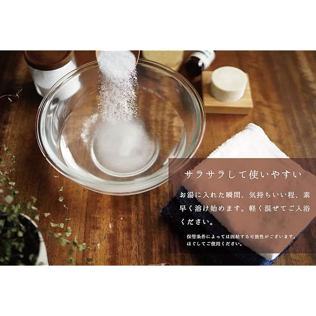 【サラサラしていて使いやすい】お湯に入れた瞬間、素早く溶け始めるので、軽く混ぜてからご入浴ください。無添加で余分なものを加えていないため、浴槽を傷めず残り湯も使用できます。入浴していると、発汗作用ですっきりデトックス。冷えが気になる時や温まりたいときに。ぽかぽかじんわり…体が温まる感覚をお楽しみください。