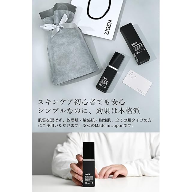【男の肌悩みを1本でケア】化粧水・乳液・クリーム・美容液を1本に凝縮。カサつき・テカリ・べたつき・ひげ剃り後のヒリヒリ・疲れた肌印象・毛穴が目立つ。そんな大人の男性の肌悩みケアする注目成分を配合しました。オールインワンジェルだからひと塗りでお手入れ完了。朝晩2回使用でたっぷり約2ヵ月分。【高保湿でハリ肌】保湿の王様と呼ばれる「ヒト型セラミド」をはじめ「コラーゲン」「ヒアルロン酸」「プラセンタ」など35種類の保湿成分を贅沢に配合。スポンジのように水分を抱え込み、隙間なくヒタヒタに潤します。肌の乾燥を防ぎ、潤いのあるみずみずしいハリ肌に。【長時間保湿でテカらない】保湿力の高さだけではなく、潤いの持続力が長時間続くのもZIGEN オールインワンジェルの大きな魅力。潤いをキープすることで過剰な皮脂分泌を抑え、テカりやベタつきを抑えます。乾燥肌だけでなく、オイリー肌にお悩みの方にもおすすめ。【見た目年齢が変わる】金・銀・白金やビタミンA、ビタミンC、ビタミンB6など美容効果の高い製成分を配合。紫外線や年齢からくる肌悩みをサポートします。さらにハマメリス水がアプローチし、男肌の毛穴悩みもキュッ!若々しい印象に。30代、40代、50代の多くの男性に選ばれています。【ノーストレスな使用感】オイルフリー設計でみずみずしくサラっとした使い心地。ジェルがしっかり浸透するので、肌表面にベタつきを残しません。化粧水では物足りない、クリームのベタつきが苦手な男性の為にオイルフリー、粘度調整剤不使用のジェルタイプ。徹底した7つの無添加処方で敏感肌でも◎信頼の日本製。