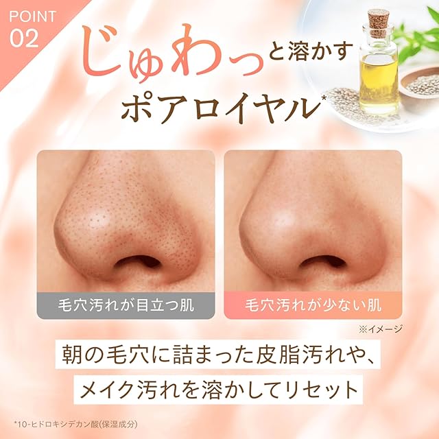 【朝のスキンケアが完結】クレンジングなのに朝のスキンケアまで完結する拭き取りタイプのクレンジングウォーター(ローズマリーの香り)です。天然由来成分「ポアロイヤル」で、朝の毛穴に詰まった皮脂や角栓汚れを溶かしてリセット。