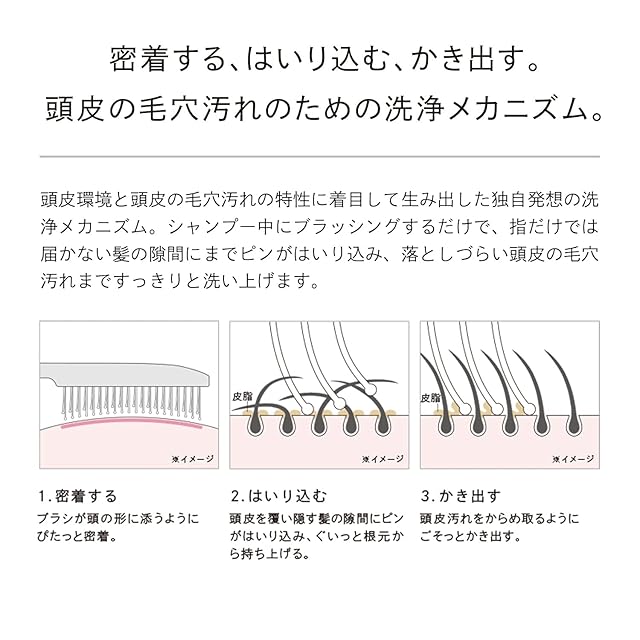 【頭皮までピンがはいり込む グラデーションタッチ毛】2つのかたさのピンが段階的に触れることで、届きにくい頭皮にまではいり込みます。