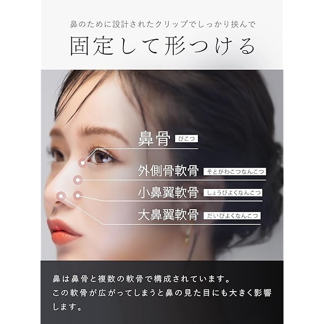 【挟んで固定し、憧れの鼻に】鼻のために設計されたクリップでしっかり挟んで固定し、形をつけます。鼻の左右から挟み込み、圧を加えながら固定することで、スマートな鼻の印象を演出します。さまざまな鼻の形を追求した商品設計により、幅広い年代・形状の鼻にフィットする独自の形状を開発しました。