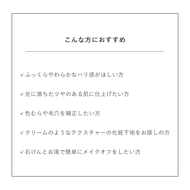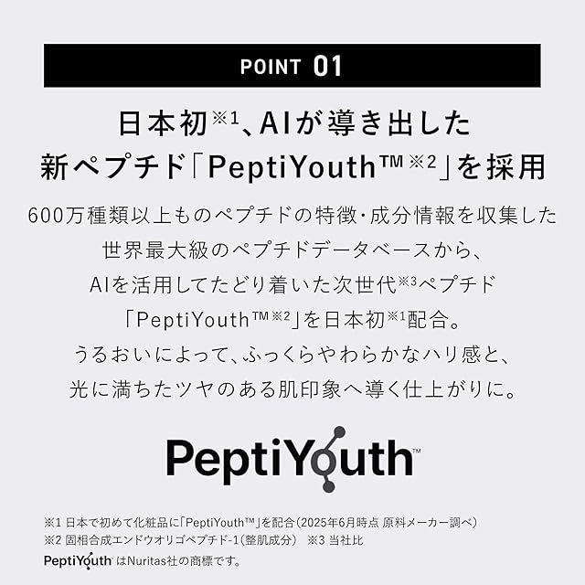 【商品について】◆日本初、AIが導き出した新ペプチドPeptiYouthを採用◆レフ板発想の毛穴レスなツヤ美肌へ◆保湿力は119%に!自然由来指数92%の美容液プライマー◆敏感肌パッチテスト、ノンコメド試験済み。肌にやさしい石けんオフ