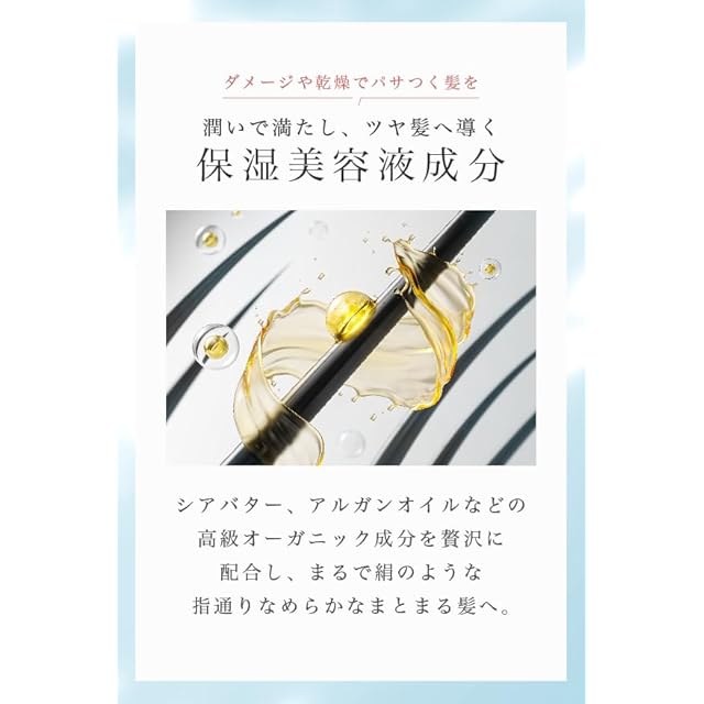 【髪質改善×艶】 厳選された保湿成分が髪のダメージを補修しながら、理想的な潤いバランスを実現。キューティクルを整え、光を纏うような艶めく美髪へ。一度使えば手放せない感動を。