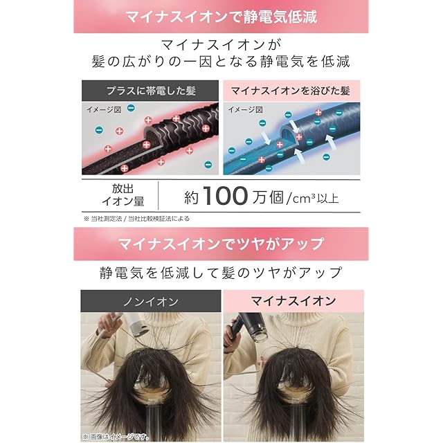 吹出口の2ヶ所からマイナスイオンを発生させ、風に乗せて放出することで、マイナスイオンを髪の根元までしっかり行き渡らせます。髪の広がりの一因である静電気を低減し、髪のツヤもアップします。※イメージ図