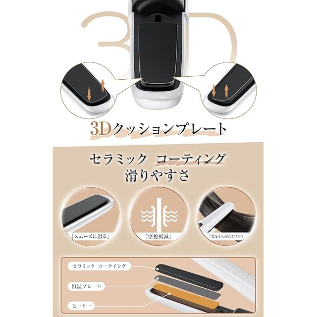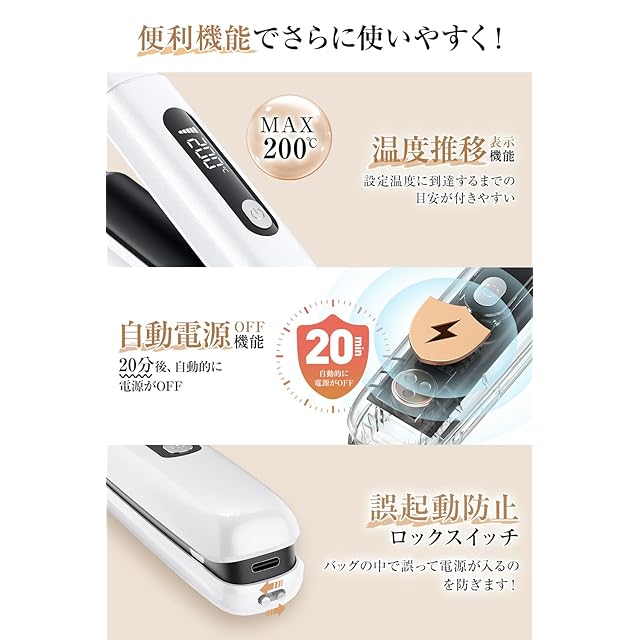 ⑤【安心安全設計&誤操作防止ロック搭載】 誤操作防止ロック付きで、バッグに入れても電源が誤って入る心配なし。さらに過熱防止機能・20分自動電源OFF・転倒保護設計を搭載し、安全性にも優れています。マイナスイオン効果で静電気を抑え、毛先までしっとりまとまり、美しいツヤを長時間キープ。毎日安心して使える充電式コードレスストレートアイロン・ワイヤレスカールアイロンは、自分用にもギフトにもぴったりです。