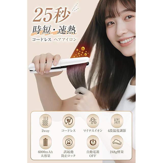 ①【25秒急速加熱&コードレスヘアアイロン】 最新型のコードレスヘアアイロンは、わずか25秒で立ち上がる急速加熱機能を搭載。高性能セラミックプレートが髪に均一な熱を与え、ツヤのあるストレートヘアや柔らかなカールを長時間キープ。コンセント不要の充電式ヘアアイロン・ワイヤレスヘアアイロンなので、旅行先や外出先でもすぐに使えます。ストレートアイロンやカールアイロンを別々に持たず、1台で自由自在にスタイリング可能です。