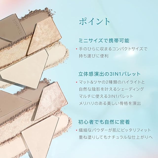 日本市場向け最適化された3in1コンパクトパレット TIMAGEの限定デザインとなる3色ミニパレットは、マットハイライト・ツヤハイライト・シャドウの多機能をミニサイズに凝縮。微細パウダーがアジア人の肌質に自然に密着し、頬骨の立体感強調から鼻筋のシャドウ加工まで、プロ仕様の仕上がりを実現。初心者でもムラなく重ね塗りできる特殊配合技術を採用し、付属のアングルブラシとダブルサイドパフで化粧直しも容易。肌トーンに合わせた3色展開で、外出先でも本格的な立体メイクを手軽に完成させる携帯性の高さが特徴。