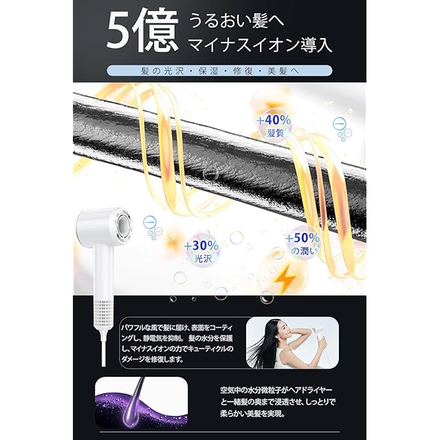 【3億マイナスイオン・美髪ケア】髪に潤いを与える3億マイナスイオンを搭載した ヘアドライヤー。静電気やパサつきを抑え、まとまりのある髪に仕上げます。髪質改善に最適な ドライヤー 大風量 は、速乾性能も優れており、髪を美しく整える ドライヤー速乾。コンパクトでも効果的な ドライヤー を探している方におすすめです。