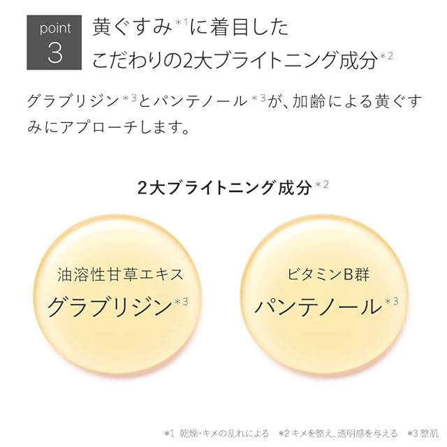 【美容成分を厳選】グラブリジンやパンテノールなど、肌に効果的な美容成分をたっぷり配合。ダメージを受けやすい大人の肌をやさしくケアしながら、透明感をアップさせます。