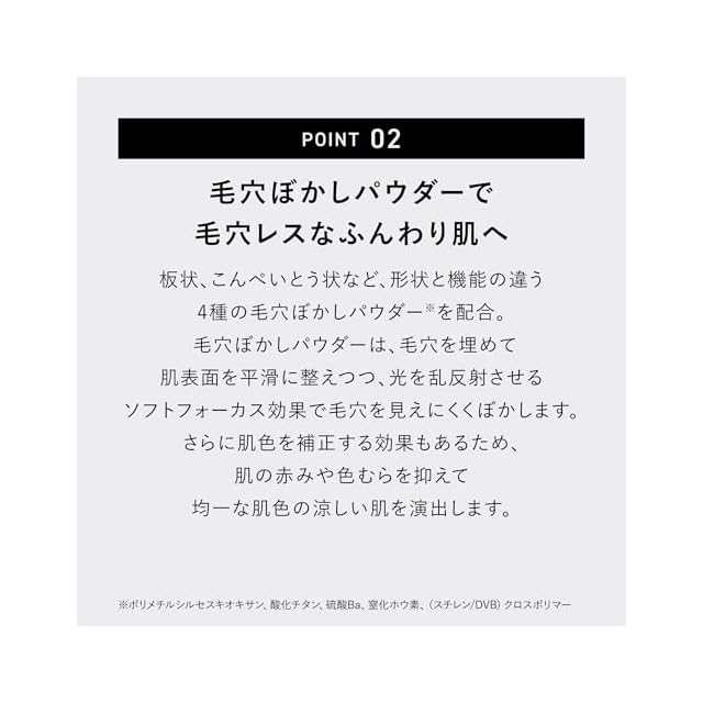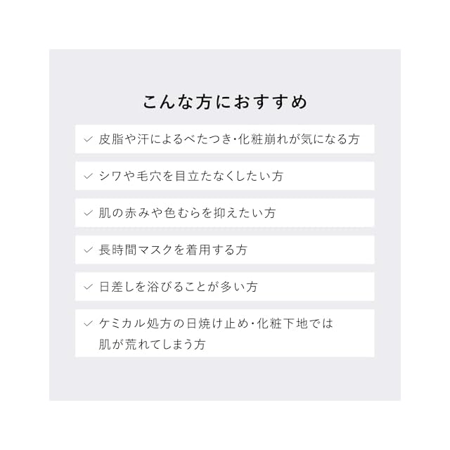 皮脂や汗によるテカリ、ベタつきを防ぐ化粧下地 皮脂や汗によるテカリ、ベタつきを防ぐ化粧下地。毛穴ソフトフォーカス効果でなめらかな陶器肌へ。