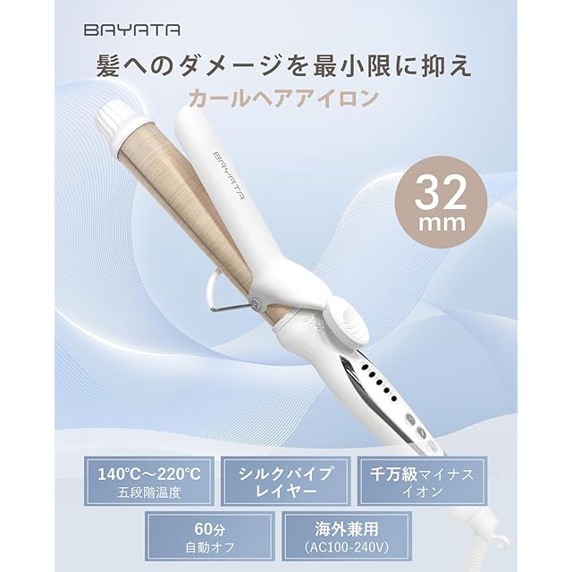 商品名:BAYATA コテ 32MM ヘアアイロン カールアイロン シルクプロコテ【瞬間水分蒸発しない・140℃〜220℃・マイナスイオン・海外対応】5段階温度調節 全髪質対応 急速立ち上がり 1時間自動オフ 100V-240V海外対応