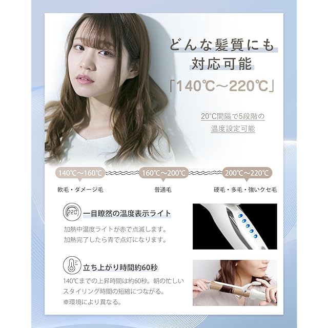 【140℃~220℃6段階の温度調節可能・全髪質対応】BAYATAシルクプロコテはMAX220℃のプロ仕様で、140℃~220℃まで、20℃ごとに6段階で温度調整が可能です。髪質やヘアスタイルに応じて最適な温度を調節できます。また、耐熱性が強いスタンドを搭載しており、熱が冷めるのを待つことなく置けるのが便利です。