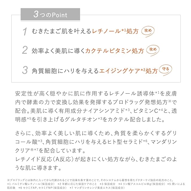 安定性が高く穏やかに肌に作用するレチノール誘導体*1を採用。美肌に導く有用成分ナイアシンアミド*2、ビタミンC*3、グルタチオン*2とともにお肌のことを考えた最適濃度でカクテル配合。