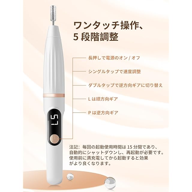 【最大 15000rpm×5 段階調整】15000 回転の強力パワーを備え、5 段階で精密に速度調整可能。細かくゆっくり磨いて削り過ぎを防いだり、効率的にネイルオフをしたりも自在。高回転時でも安定して発熱しないので、より安心して使用できます!