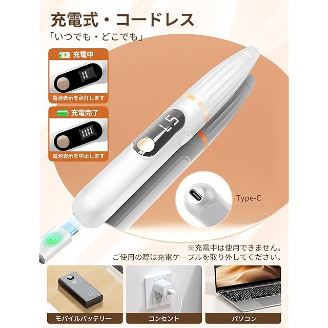 【 コードレス設計と USB 給電で】どこでも自由にネイルケア可能YAMOOCO 電動ネイルマシンはコードレス仕様で、電源コードの束縛を解消。USB ケーブルで充電可能なので、自宅のソファでも、セルフオフサロンでも、外出先でも手軽に使用できます。充電一回で長時間使用に対応し、ネイルケアの自由度を大幅アップ!