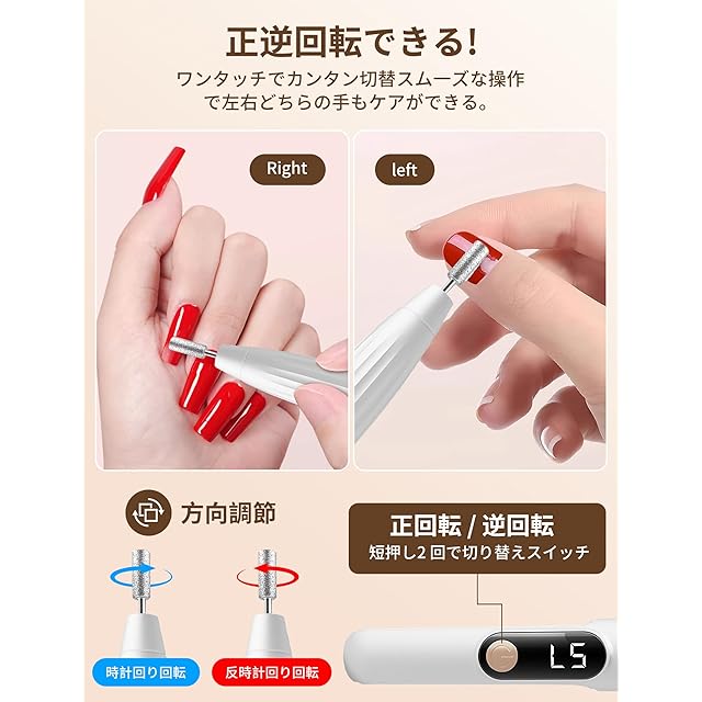 【正逆回転機能搭載】ネイルマシンは正方向と逆方向に回転可能で、利き手が左手でも右手でも、自然な持ち方でスムーズにネイルオフ作業ができます。操作性に優れ、無理な姿勢を取る必要がなく、初心者でも簡単に使いこなせるため、卸甲が格段に楽になります。