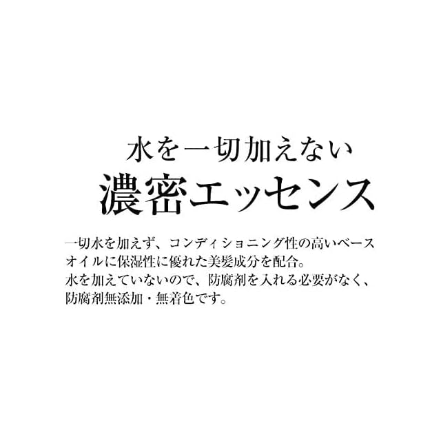 【濃密美髪エッセンス】水を一切加えず、美髪成分のみで構成されたヘアエッセンス。潤いや美髪成分を髪内部にしっかり閉じ込め、キューティクルを集中的に補修します。