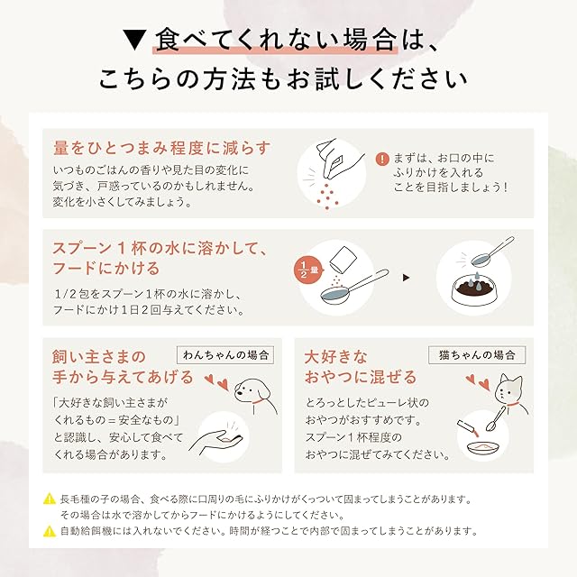 :獣医師とペット栄養管理士が共同開発した、ふりかけ状の口腔ケアサプリメントです。人向けの歯磨き市場でも注目を集める自然派原料のマスティック樹脂を使用。口内の汚れを取り除くリベチン含有卵黄粉末や口臭に働きかけるカテキン類などがお口の健康を維持します*2。ふりかけ状のため、いつものごはんに振りかけるだけの簡単習慣で使いやすい口腔ケアサプリです。*噛むことで歯垢の沈着を抑え、お口の健康を維持する