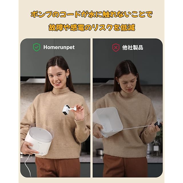 特許取得のコードレスポンプ採用:従来のペット用自動給水器のポンプについていた水中のコードを特許技術によって取り除き、猫や犬がより安全に水を飲むことができるようにしました。また、動作音は20dB以下で、木の葉が触れ合う音程度の静かなレベルです。ご注意:本製品の給水システムはコードレスポンプを採用していますが、本体の電源はコンセントに接続する必要があります。完全ワイヤレス製品ではございませんので、あらかじめご了承ください。