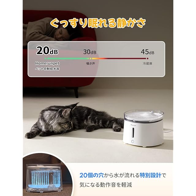 睡眠を妨げない静音設計: 20個の穴から水が流れる設計で、動作音を20dB以下に抑えました。あなたとご家族の睡眠を妨げないだけでなく、いつでも清潔な流れる水を飲むことができますので、大切な猫や犬もきっと気に入ってくれることでしょう。