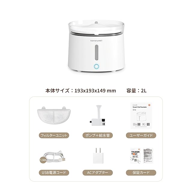 商品名:Homerunpet スマートペット用自動給水器 ワイヤレスポンプ 大容量2L LEDライト 2つの給水モード コードレス 組み立て簡単 お手入れ簡単 フィルター付き 犬 猫 水飲み器 みずのみ