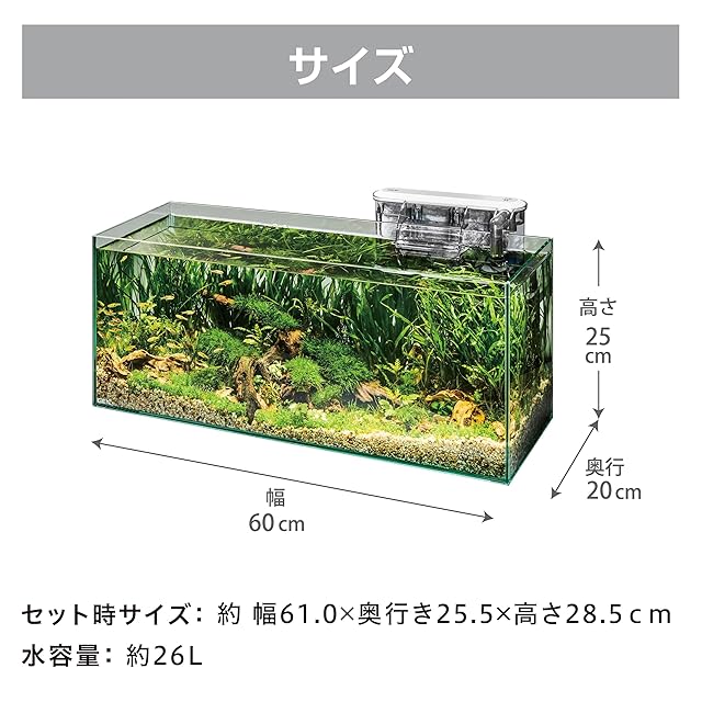 【製品仕様】水槽サイズ:約幅60×奥行20×高さ25cm、ガラス厚:5mm、セット時サイズ:約幅61×奥行25.5×高さ28.5cm、水容量:約26L