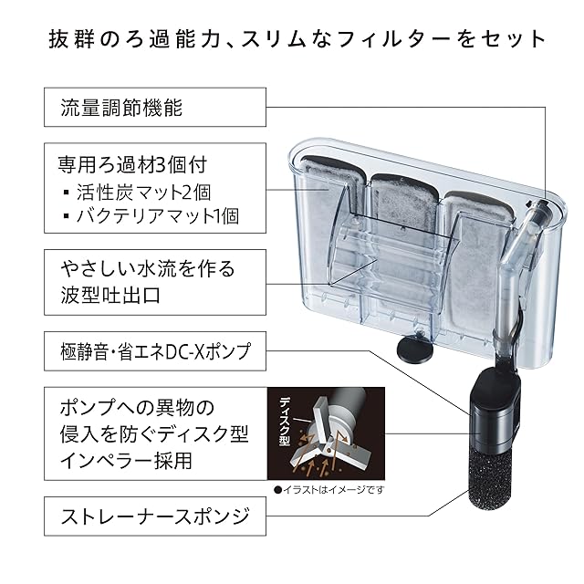 DC-Xポンプ採用のスリムフィルターをセット。極静音・省エネ。水槽はワイド設計、置き場所の自由度UPのスリムスタイル&水槽内すっきりのスリムタイプ外掛け式フィルター(スリムフィルター DC-X M3)をセット