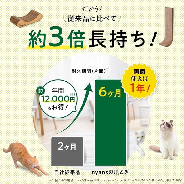 ⬛⦅nyans(ニャンズ)の爪研ぎ⦆「猫の本能に応える、究極の心地よさ」猫は本来、木で 爪研ぎ をする生き物です。だからこそ、ニャンズは猫の本能が喜ぶ「木の香り・木に近いとぎ心地」を実現した 爪研ぎ を開発しました。 とぎカスが出にくい純日本製強化ダンボールを使用。両面使えて3倍長持ちするニャンズの 爪研ぎ をぜひお試しください!