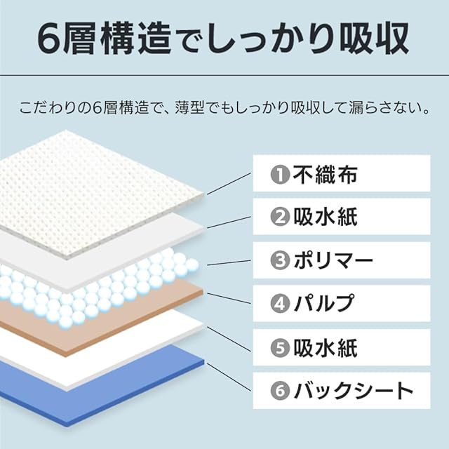 こだわりの6層構造(不織布/吸水紙/ポリマー/パルプ/吸水紙/バックシート)でしっかり吸収するため、薄型でも漏れにくい構造です。