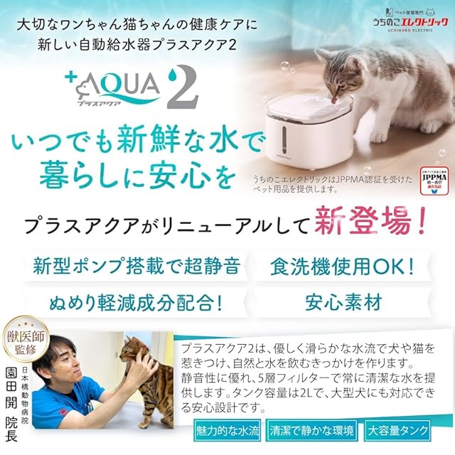 【獣医師監修】 うちのこエレクトリック プラスアクア2 猫 犬 自動給水器 8.2dB 食洗機対応 フィルター5層構造 KDFぬめり軽減素材配合 安心の日本メーカー 活性炭フィルター ヤシ殻活性炭 イオン交換樹脂