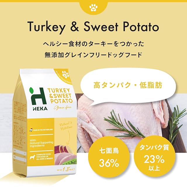 七面鳥(ターキー)36%使用 グレインフリードッグフード。単一動物性タンパク資源としてターキーを使用。高タンパクで低脂肪なヘルシー食材のターキーをつかった無添加グレインフリードッグフード。HEKAでは保存料や着色料などの人工添加物は一切使用せず、同じ役割を持ったハーブやフルーツを配合し人工添加物と同じ機能を補っております。グレインフリードッグフードが主流のオランダで製造したドッグフード。原材料を由来段階からしっかり管理し、加工できる工場で生産しています。