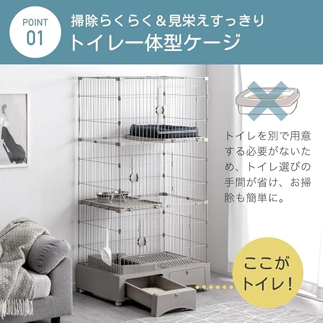 【スタッフのおすすめポイント】 ・ケージとトイレが一度に揃う! トイレ一体型キャットケージ ・扉を閉めたまま砂替え/お掃除OK ・ガード付きで砂飛びしにくい ・すっきり片付く引き出し収納 ・ベッドも置けるワイドステップ台 ・お世話しやすい3ドア+フルオープン天井 ・成長に合わせて選べる段数 ・移動に便利なキャスター付き ・おしゃれなワントーンデザイン