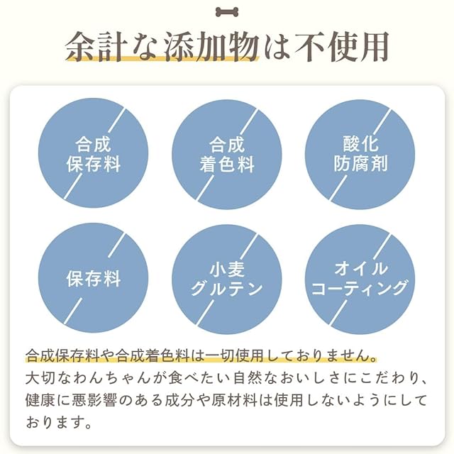 合成保存料・調味料・着色料・香料・防腐剤不使用。涙やけの原因になりやすいオイルコーティングは使用せず、「カツオ節」の風味で食いつきを強化しました。